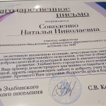 За активную жизненную позицию, неиссякаемую энергию в воспитании подрастающего поколения, участие в общественной, добровольческой, волонтерской и культурной жизни и значительный вклад в развитие Эльбанского городского поселения была награждена педагог — дефектолог МБДОУ № 47 Наталья Николаевна Соколенко.