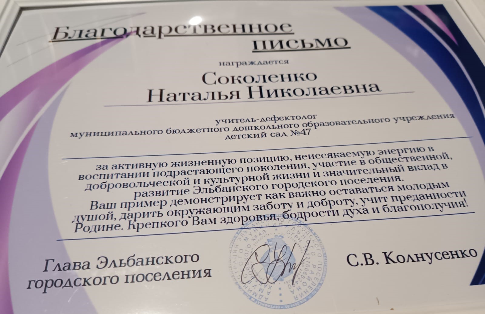 За активную жизненную позицию, неиссякаемую энергию в воспитании подрастающего поколения, участие в общественной, добровольческой, волонтерской и культурной жизни и значительный вклад в развитие Эльбанского городского поселения была награждена педагог — дефектолог МБДОУ № 47 Наталья Николаевна Соколенко.