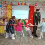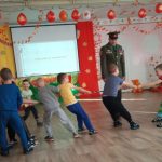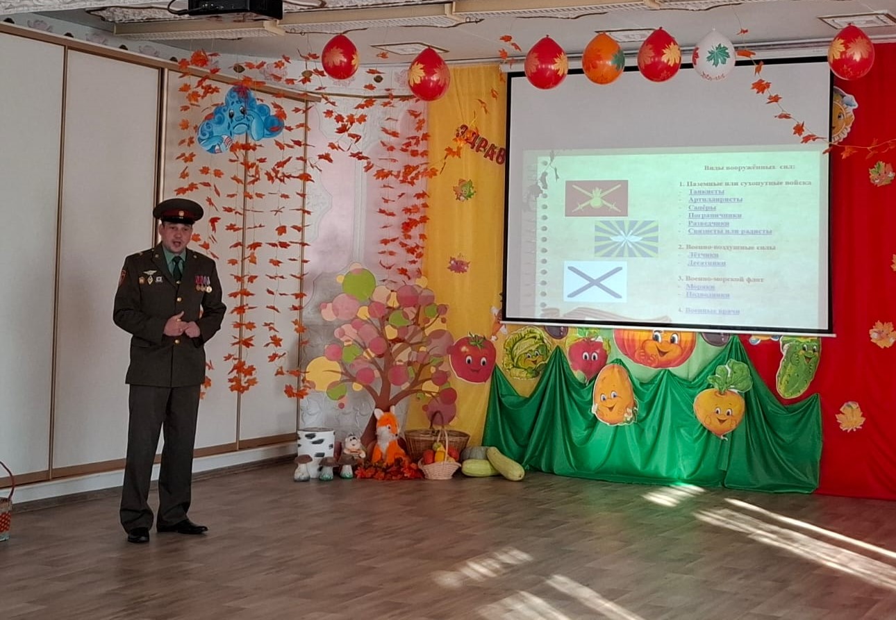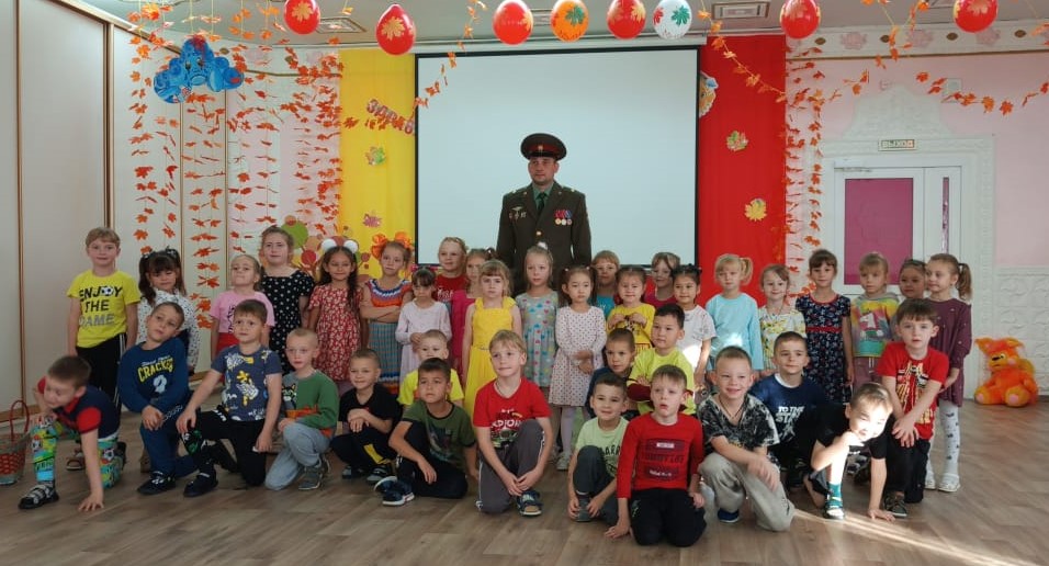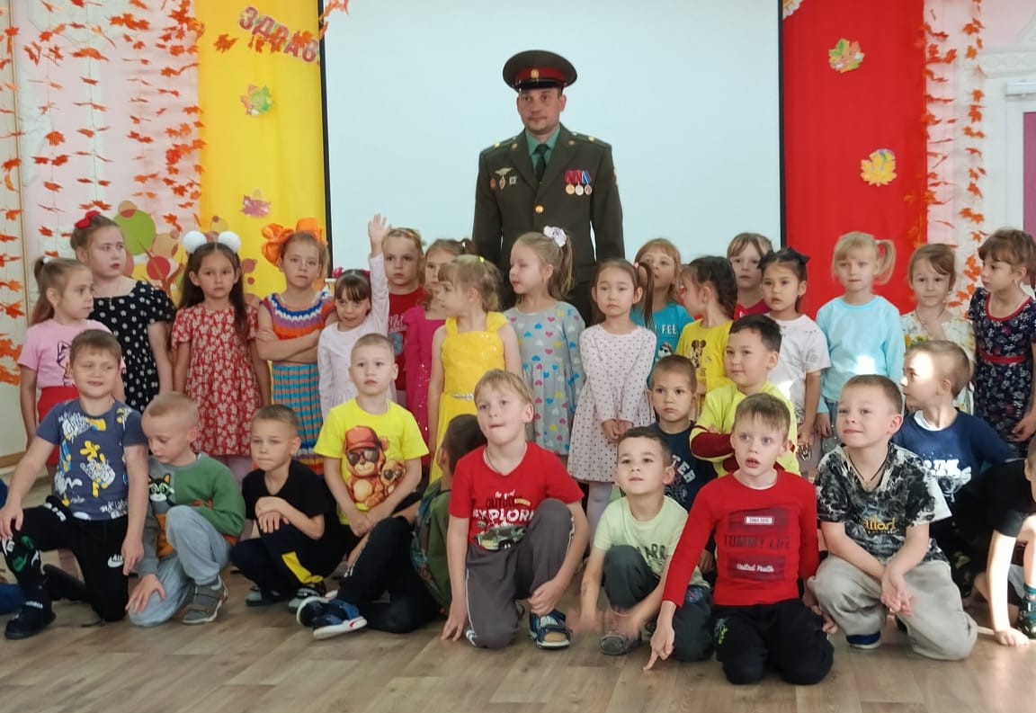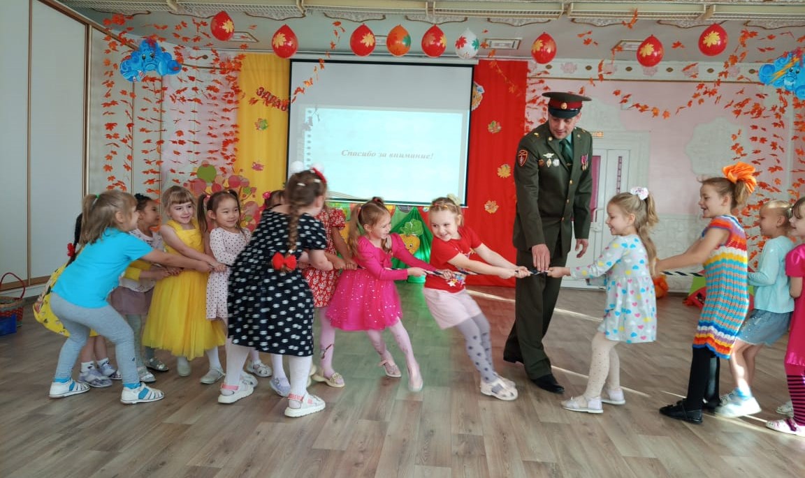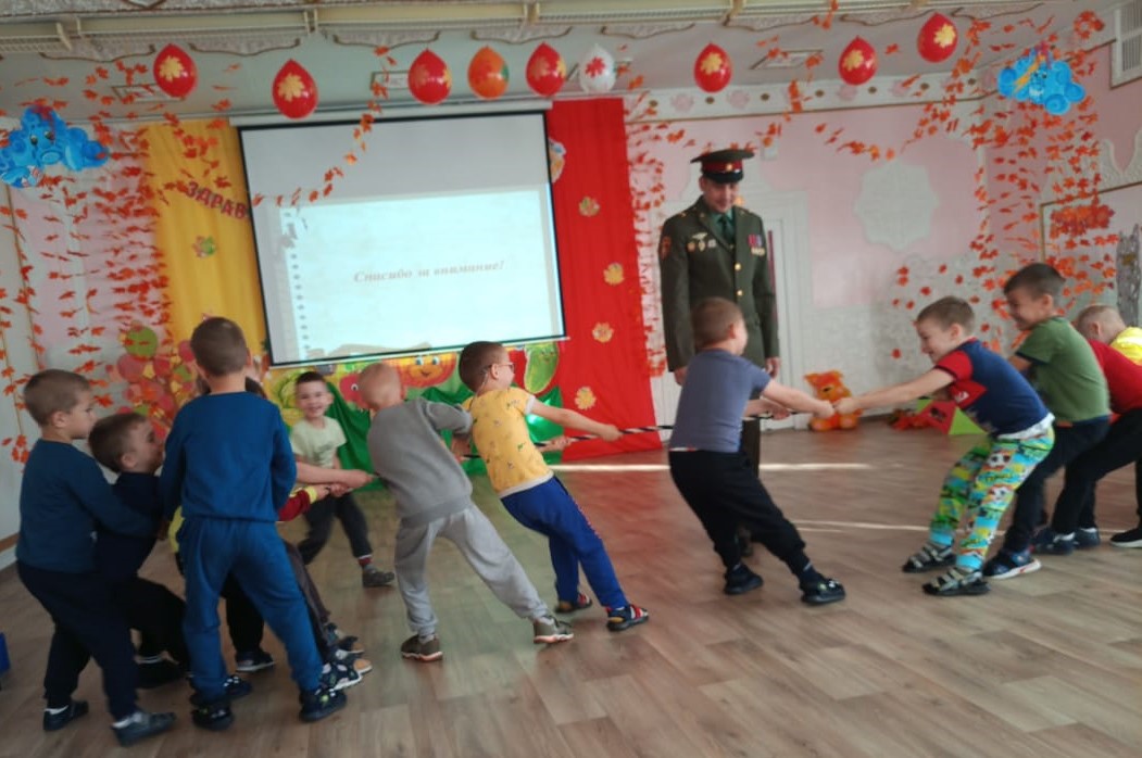 Для подготовительных и старших групп была проведена встреча с участником СВО Максимом Игоревичем В., который рассказал о военных профессиях и о защитниках нашей Родины, а также провел мини-соревнование по перетягиванию каната.