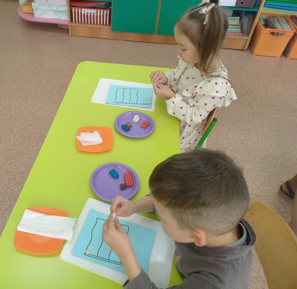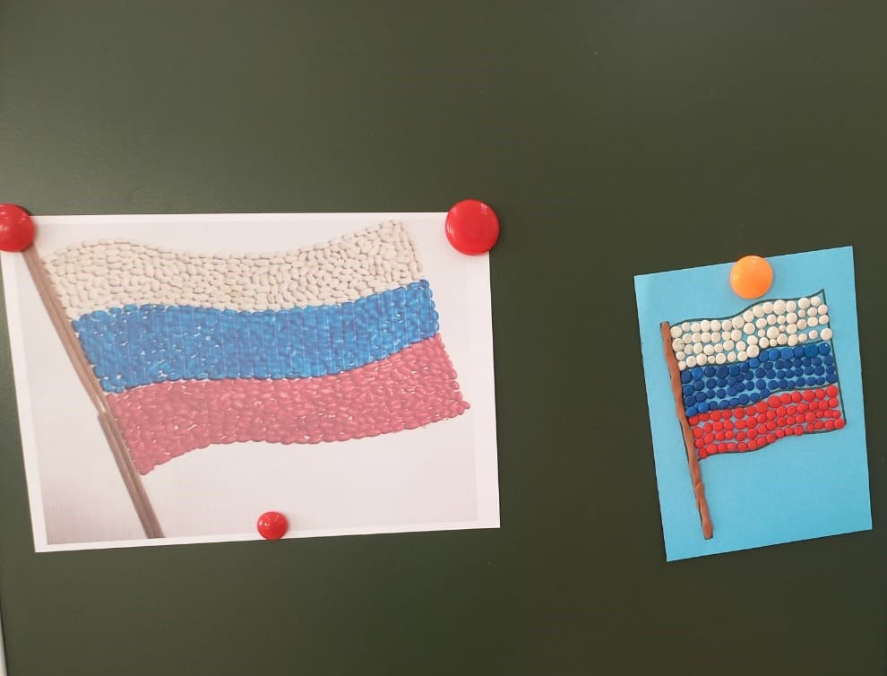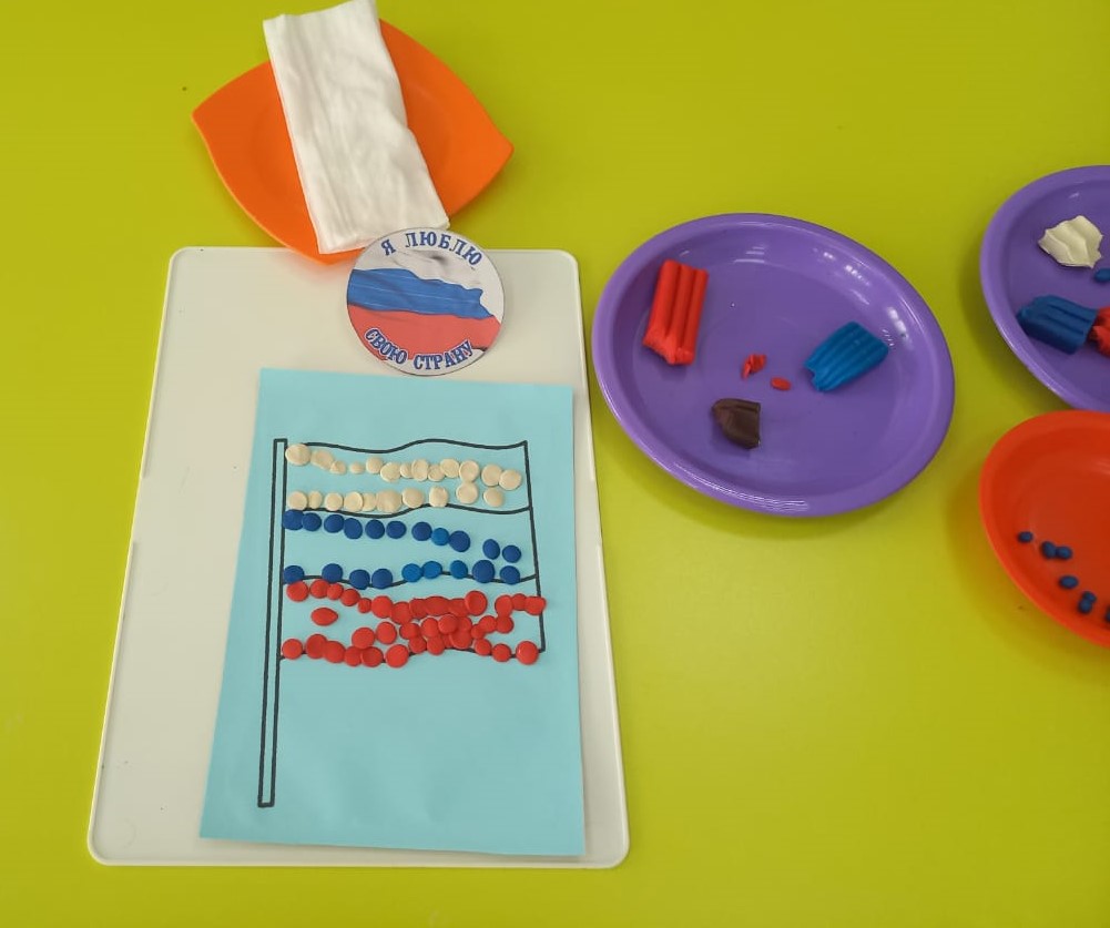 Ребята 9 группы под руководством воспитателя Кириенко И.В. повторяли государственные символы и в технике пластилинографии изготовили аппликации «Российский флаг».