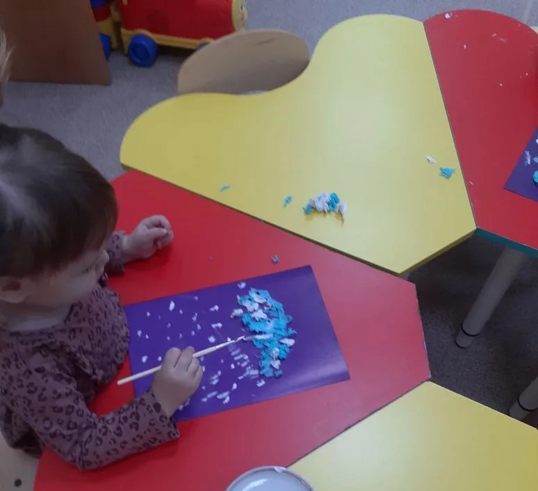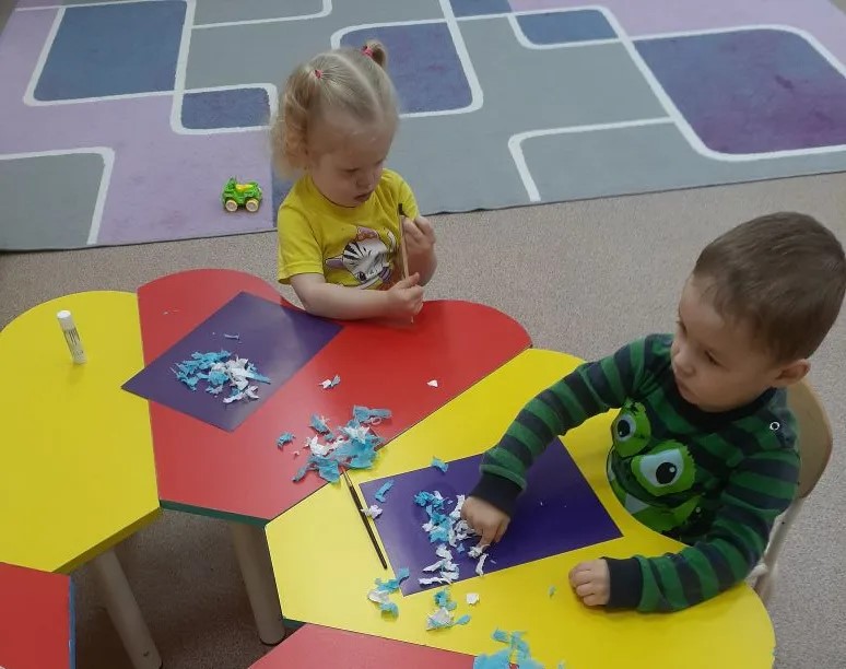 Задачи занятия: вызвать интерес к созданию образа снегопада, научить приклеивать кусочки бумажных салфеток на силуэте тучки и рисовать снег кисточкой приемом «примакивание».